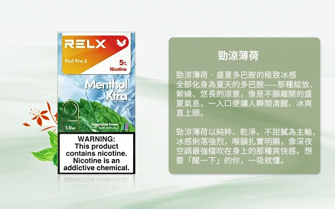 勁涼薄荷以純粹、乾淨、不甜膩為主軸,冰感俐落強烈,喉韻扎實明顯,像深夜空調最強檔吹在身上的那種爽快感。想要 「醒一下」的你,一吸就懂。
